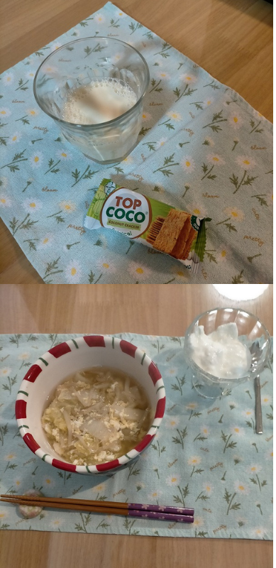 まずは空腹をココナッツクラッカーと豆乳で鎮めて、春雨スープを作りました
