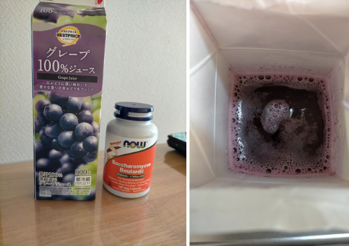 サプリと100%グレープジュースを混ぜると、不思議です、ブクブク発酵が進みます